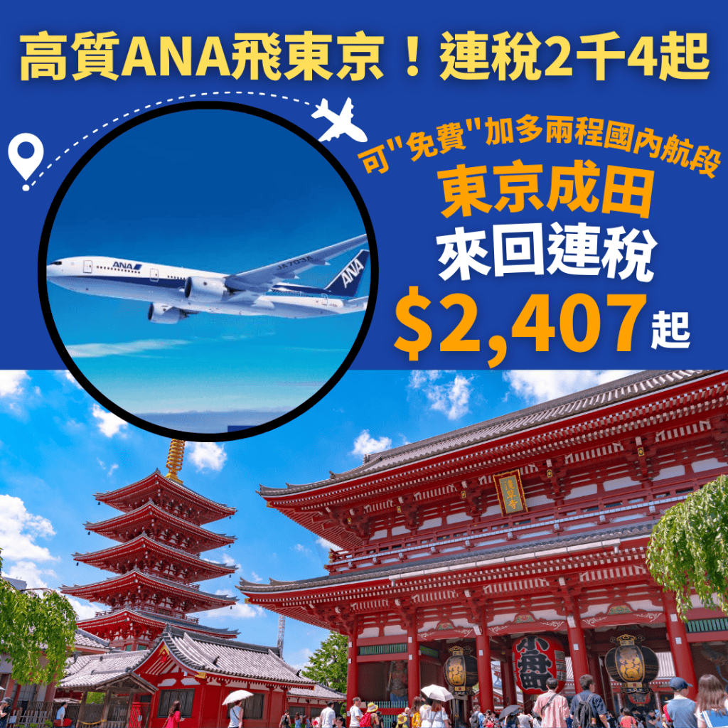 ANA官網:https://www.ana.co.jp/zh/hk (來回連稅:東京成田$2,495起、東京羽田$2,584起)