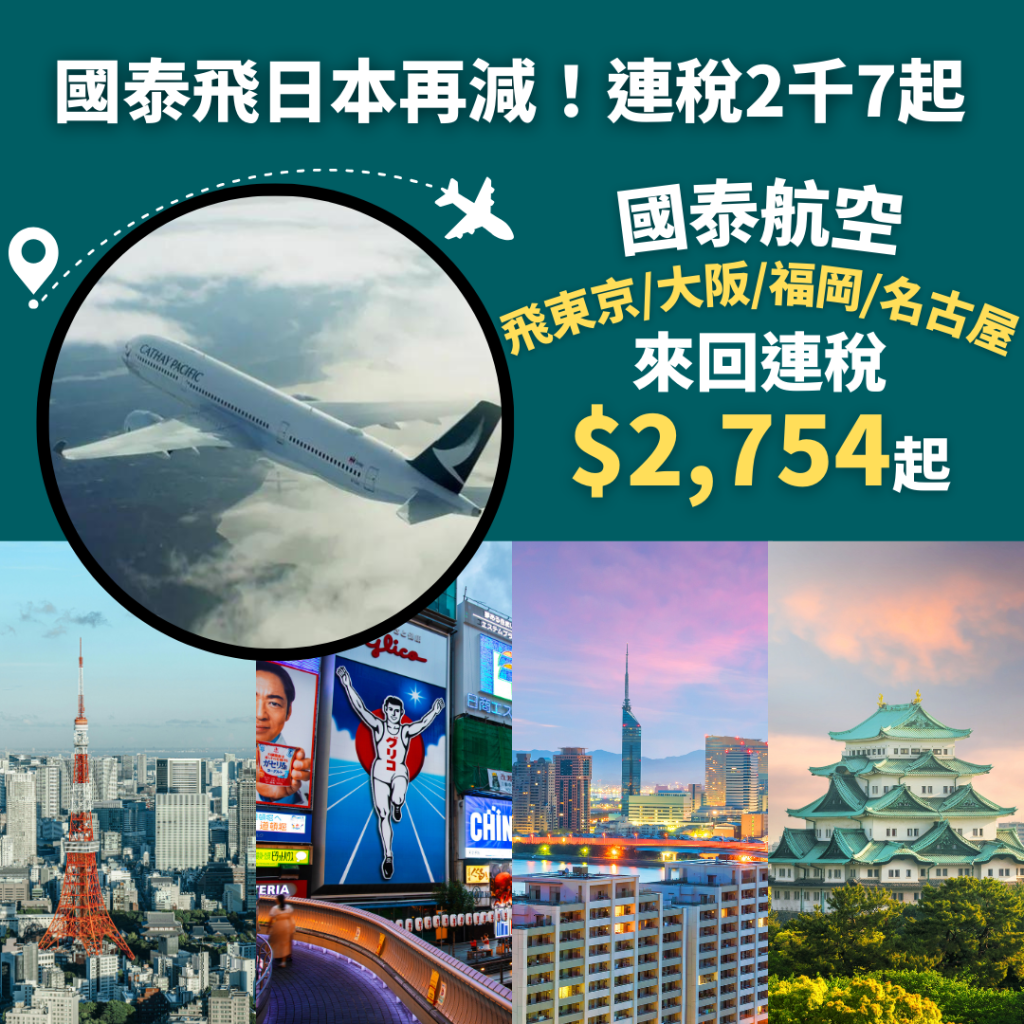 國泰飛日本再減!連稅2千7起!6月30日前出發!香港飛東京/大阪/福岡/名古屋連稅$2,754起 – 國泰航空 (優惠至1月18日)