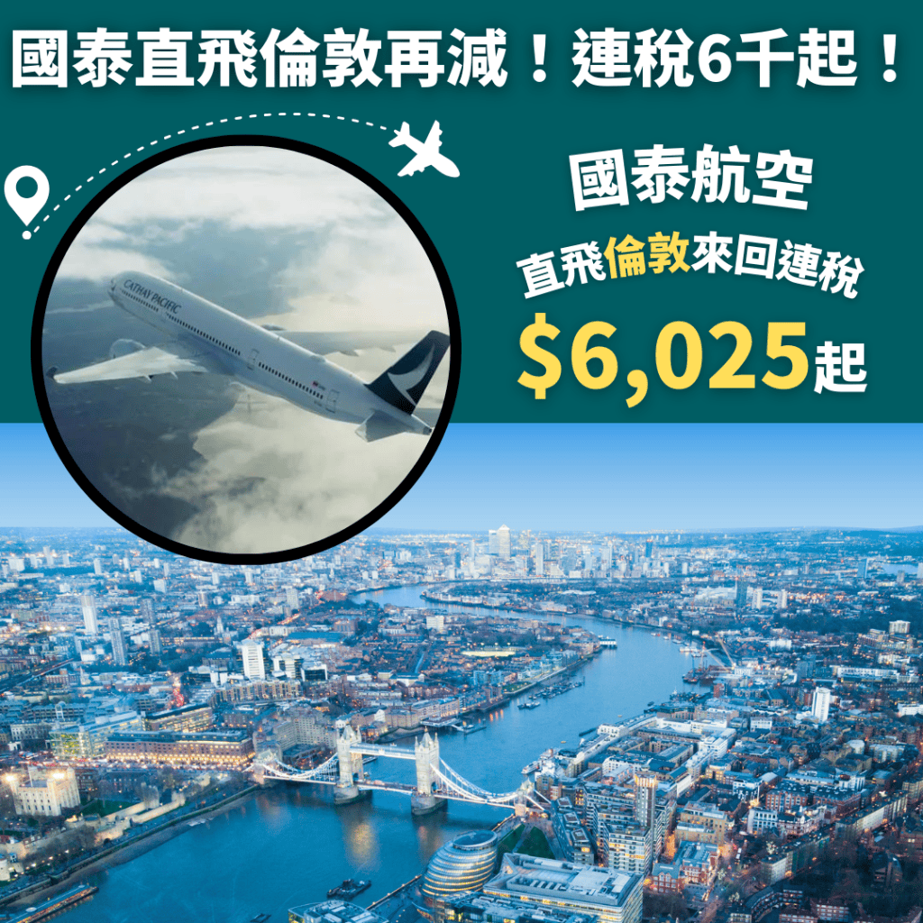 國泰直飛倫敦再減!連稅六千起!6月30日前出發!香港直飛倫敦來回連稅只需$6,025起 – 國泰航空 (優惠至1月18日)