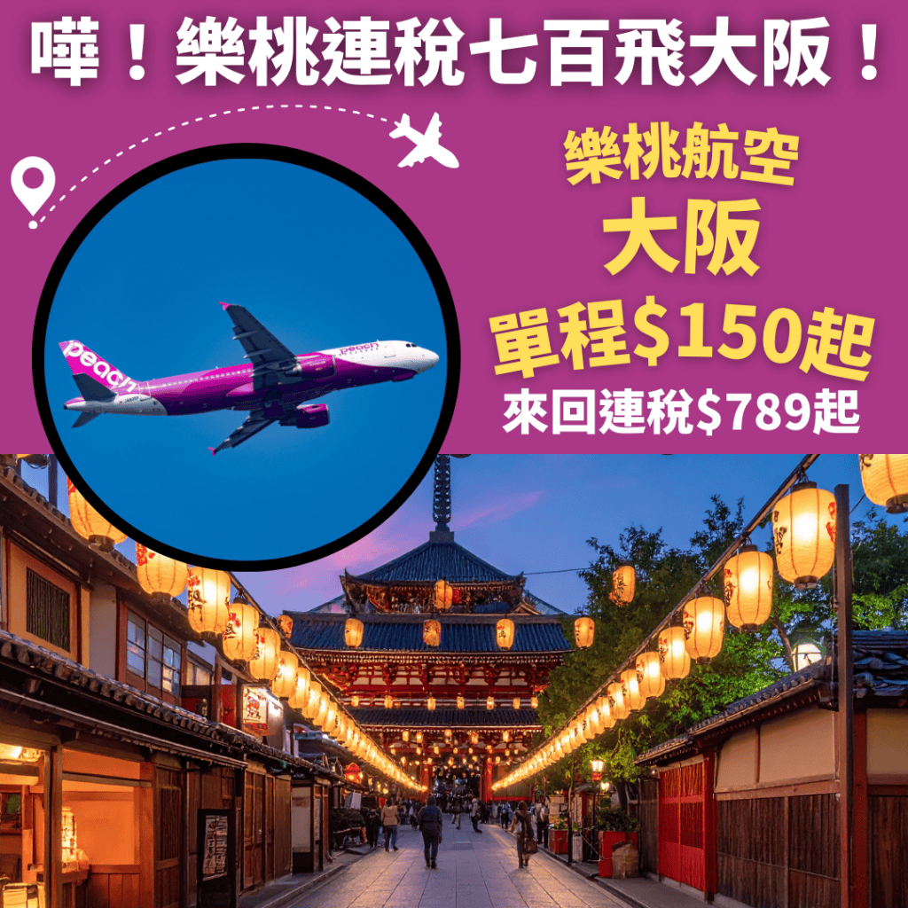 嘩!平到癲!最平連稅$789來回大阪!樂桃新春限時優惠!10月24日前出發!香港飛大阪單程只需$150起 (不收燃油附加費) – 樂桃航空 (優惠至1月18日)
