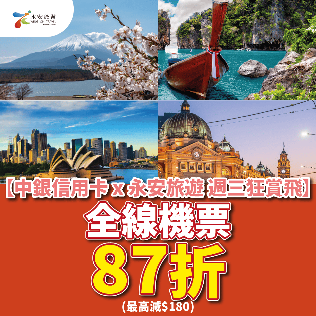 係時候買機票去旅行啦!【中銀信用卡 x 永安旅遊|週三狂賞飛】全線航點限時87折優惠嚟啦!最高減$180!