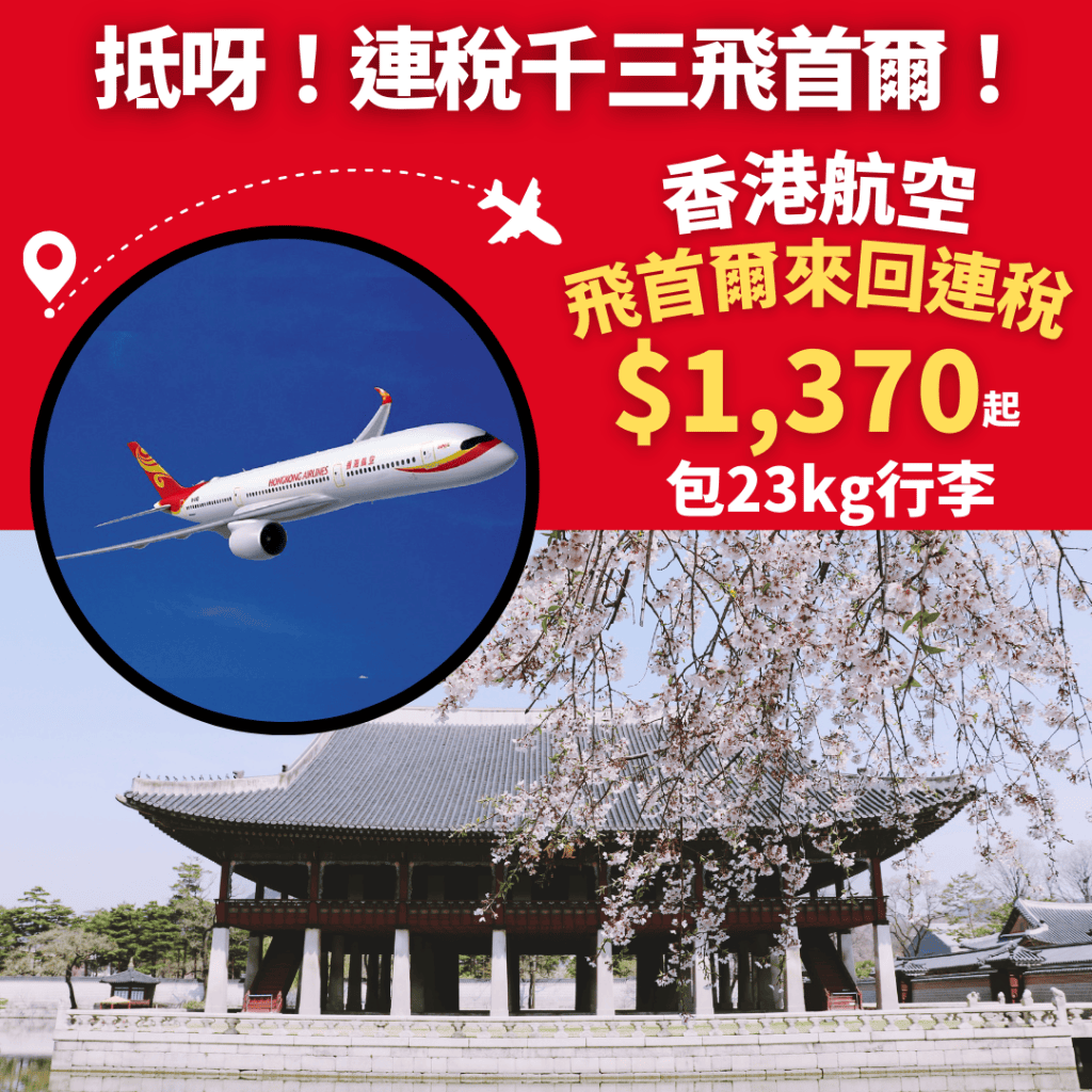 抵呀!連稅千三飛首爾!包23kg寄艙行李!6月30日前出發!香港飛首爾來回連稅只需$1,370起 – 香港航空 (優惠至2月3日)