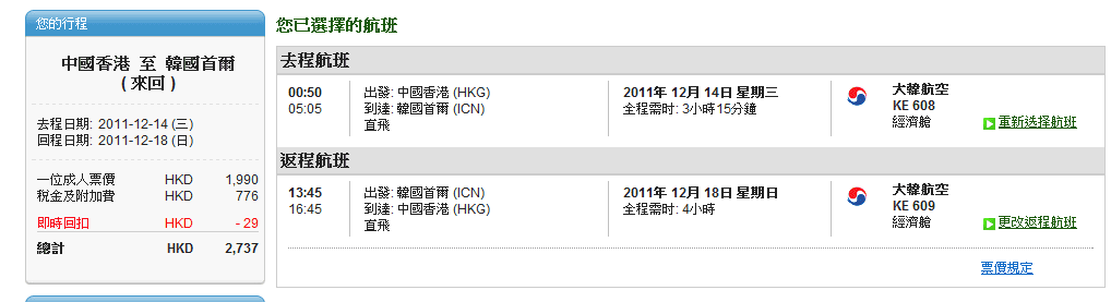 經我們測試,以12月14日出發首爾,12月18日返回為例