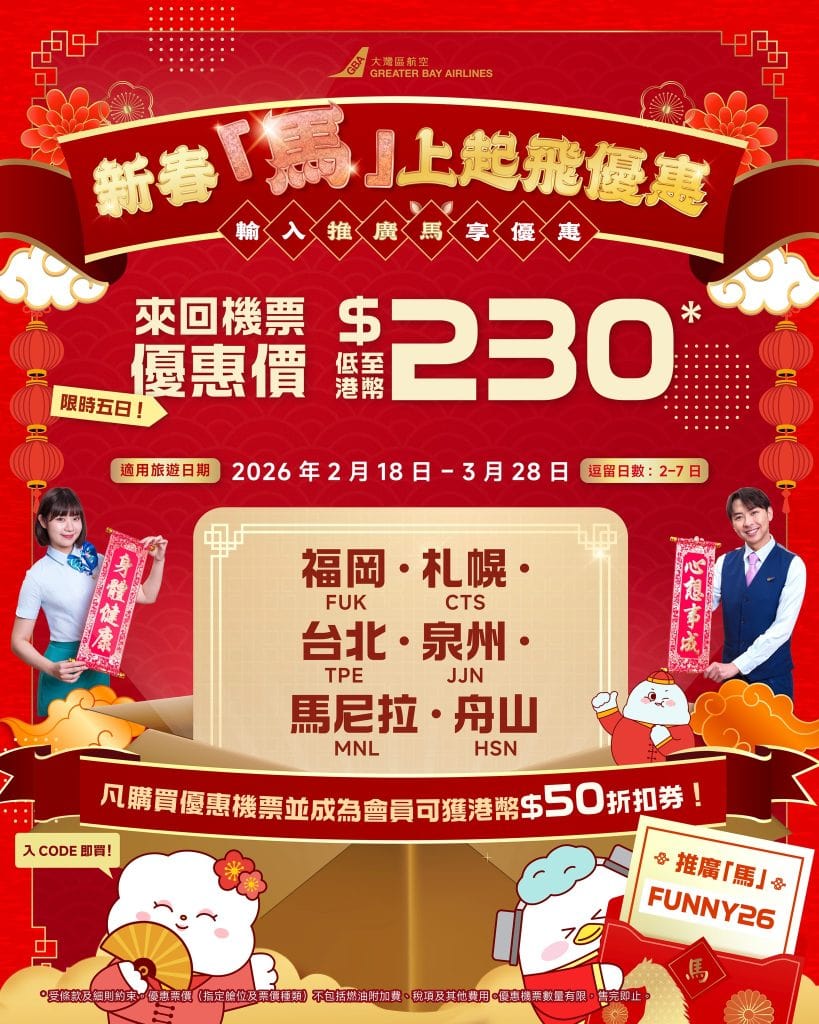 大灣區航空推出咗新春「馬」上起飛優惠!