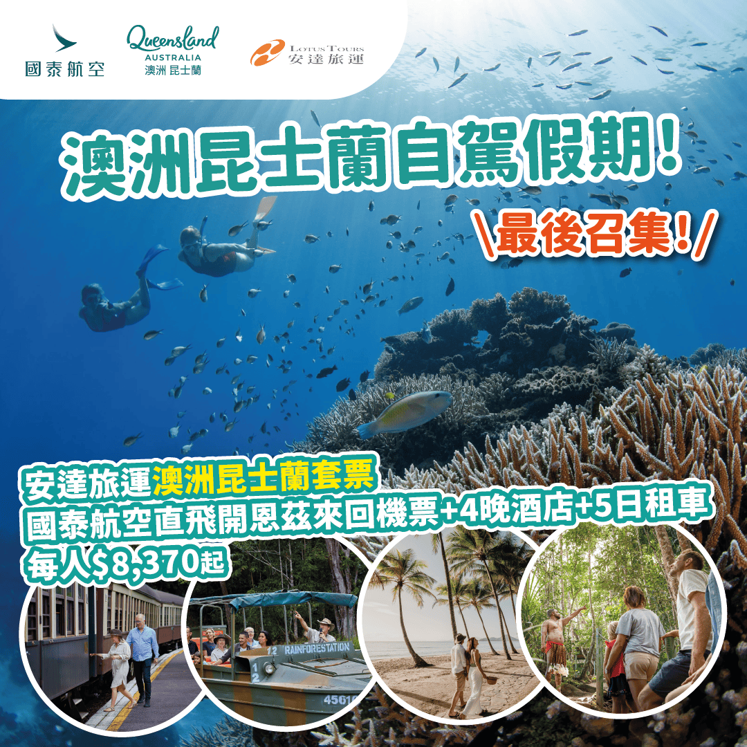 【安達旅運抵玩套票優惠】最後召集!澳洲昆士蘭自駕假期!國泰航空直飛開恩茲來回機票+4晚酒店+5日租車套票,每人$8,370起!