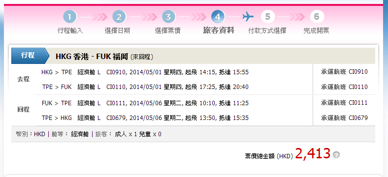我們以福岡5月1日去,5月6日返,機票連稅$2,413