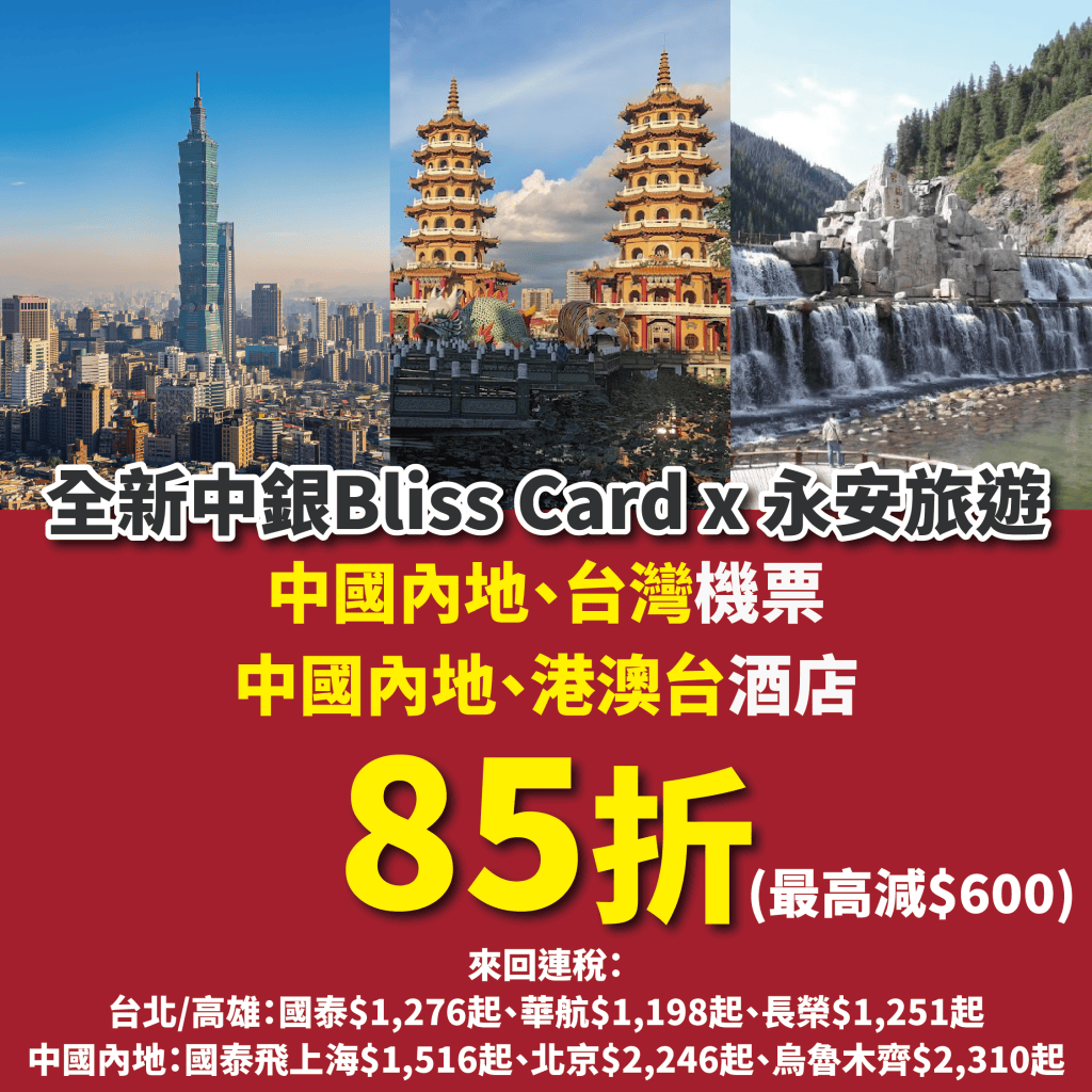 【全新中銀Bliss Card x 永安旅遊】中國內地、台灣機票 / 中國內地、港澳台酒店85折優惠(最高減$600)!台北/高雄來回連稅:國泰$1,276起、華航$1,198起、長榮$1,251起;國泰飛上海$1,516起、北京$2,246起、烏魯木齊$2,310起