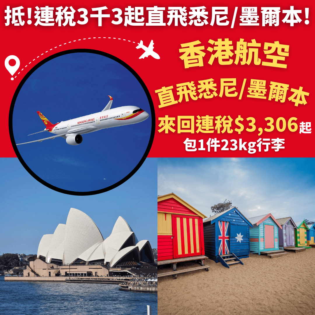 香港直飛墨爾本來回連稅只需$3,306起、悉尼$3,449起