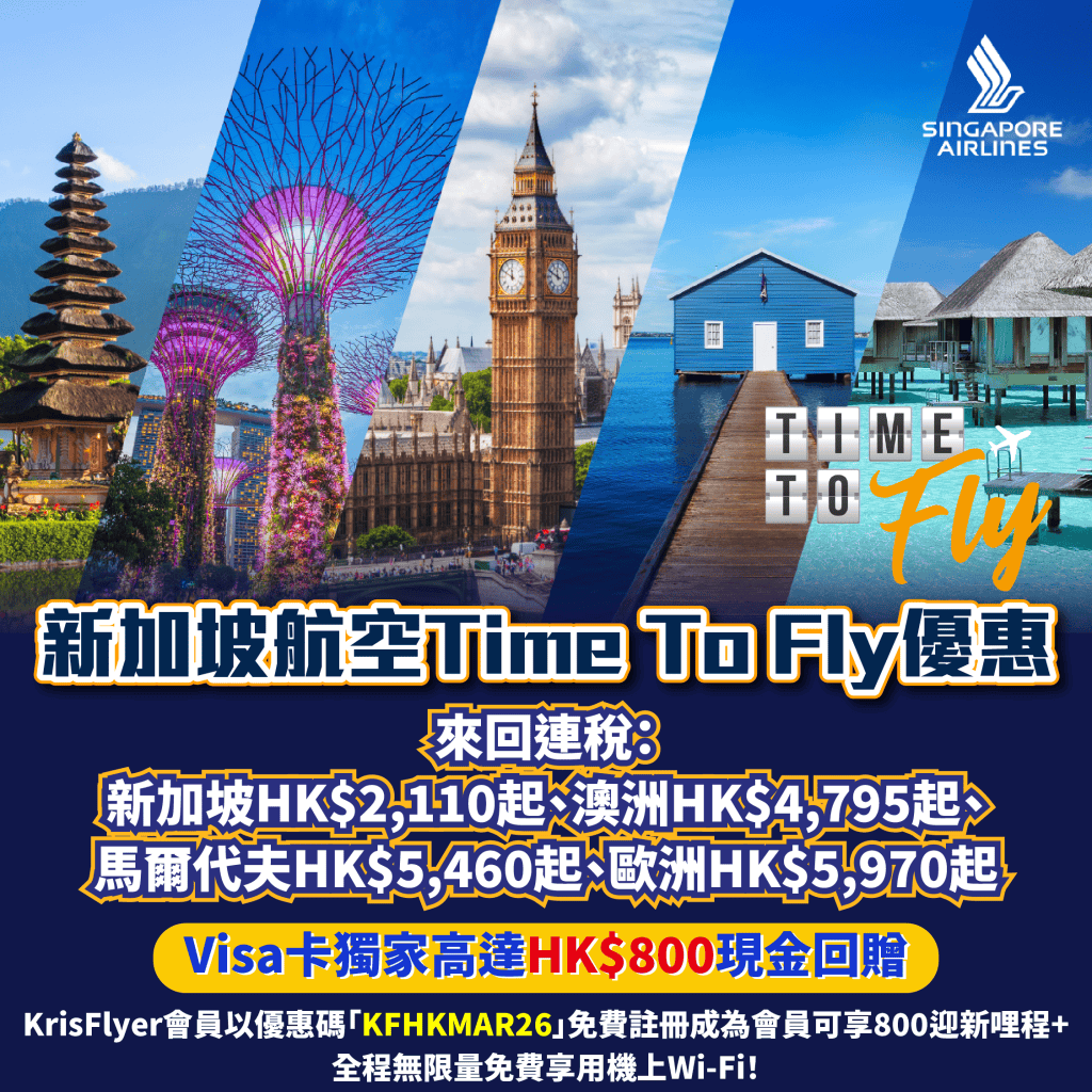 新加坡航空Time To Fly優惠!飛新加坡/印尼/馬爾代夫/澳洲/歐洲等地都有優惠!來回連稅:新加坡$2,110起、澳洲HK$4,795起、馬爾代夫HK$5,460起、歐洲HK$5,970起!Visa卡獨家高達HK$800現金回贈!KrisFlyer會員全程無限量免費享用機上Wi-Fi,仲可以賺哩程!