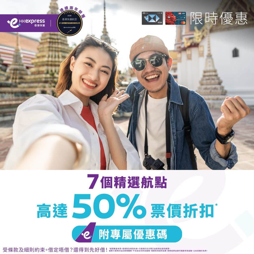 大家只要於HK Express網頁版輸入優惠代碼「HSBCUO26」並以滙豐信用卡付款可享低至5折優惠