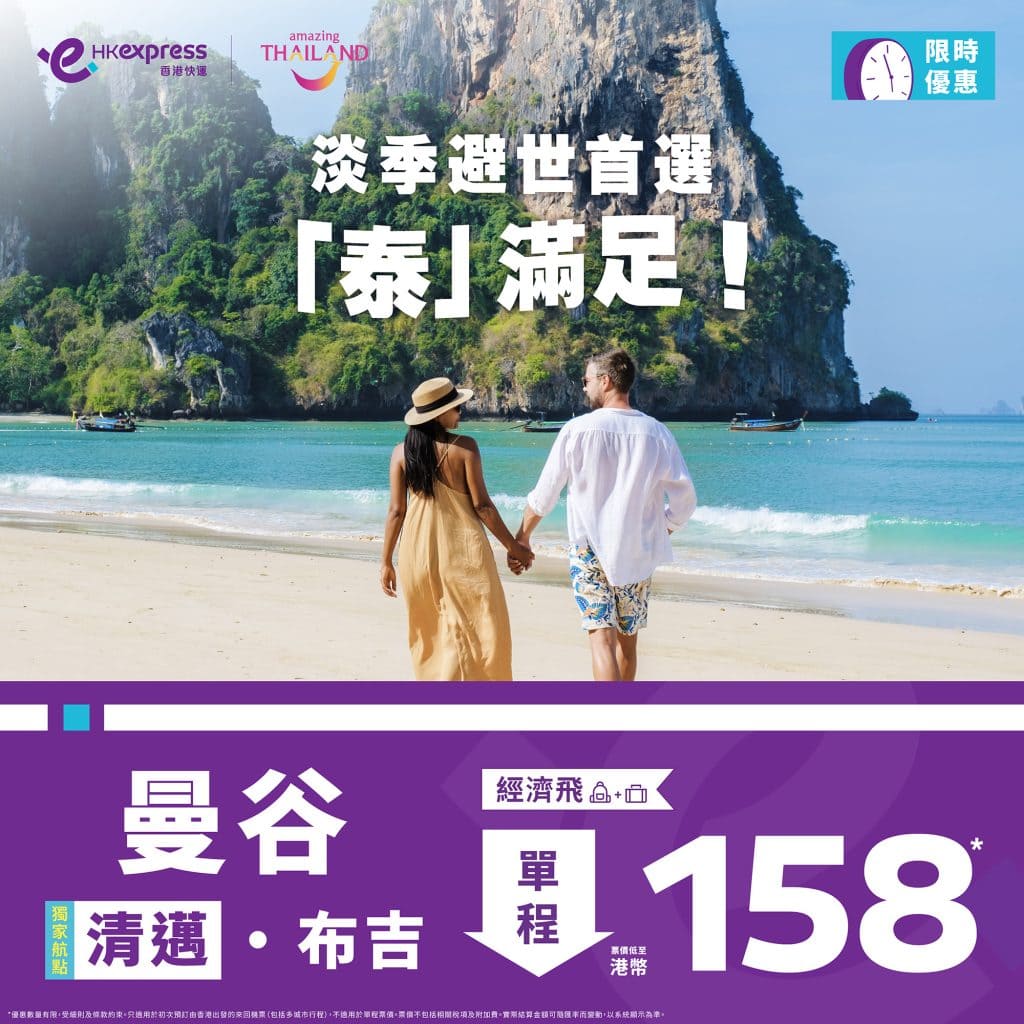 泰國限時優惠!6月30日前出發!香港飛曼谷/布吉/清邁單程只需$128起 – HK Express (優惠至3月25日)