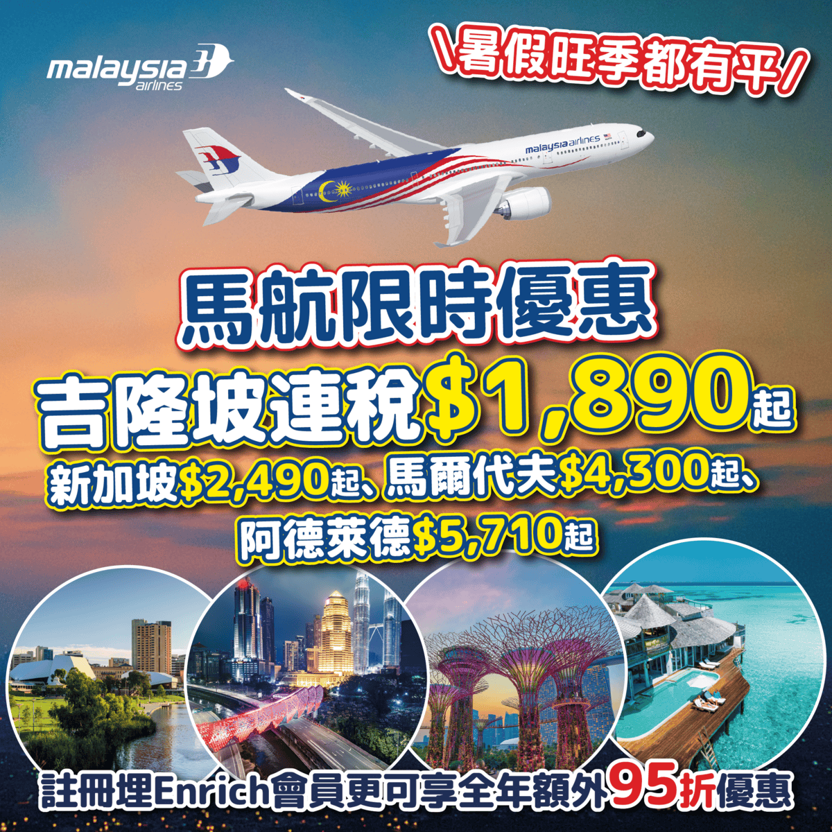 連稅$1,890起飛吉隆坡!馬航限時優惠!暑假旺季都有平!12月18日前出發!註冊埋Enrich會員可享全年額外95折優惠!送你吉隆坡 x 古晉5日4夜行程!