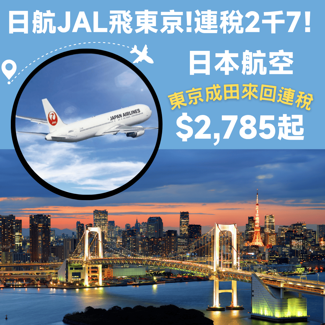 嘩!日航JAL飛東京連稅2千7起!6月30日前出發!包2件各23kg寄艙行李!香港飛東京成田來回連稅只需$2,785起 – 日本航空 (優惠至3月31日)