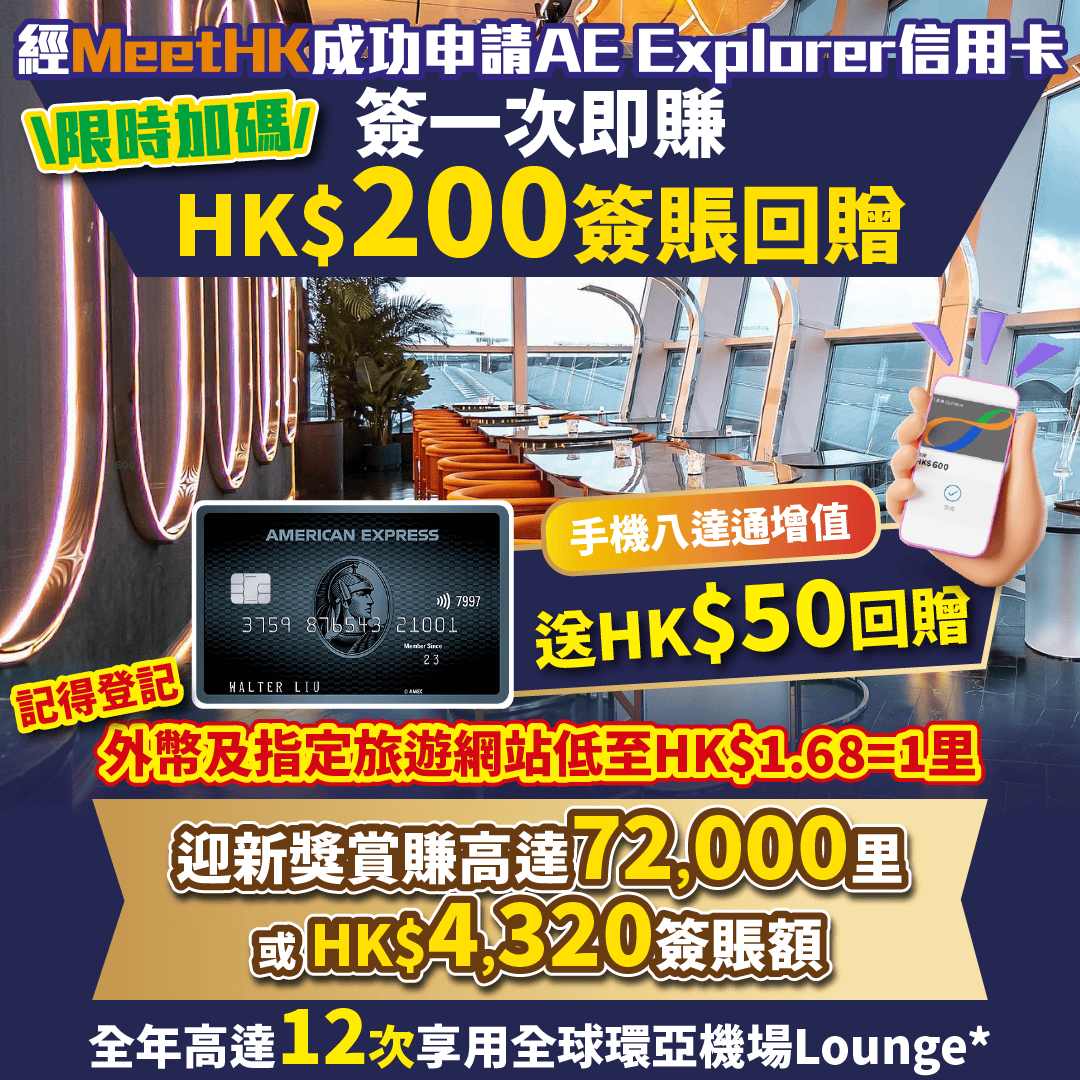 由即日起至2026年4月28日,經MeetHK指定連結(https://meethk.net/4mlwseQ)申請AE Explorer信用卡,於批核後首3個月內完成首次簽賬,即可享HK$200簽賬回贈^!