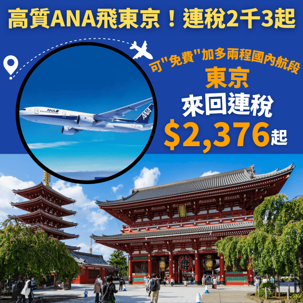 ANA官網:https://www.ana.co.jp/zh/hk (來回連稅:東京成田$2,584起、東京羽田$2,573起)