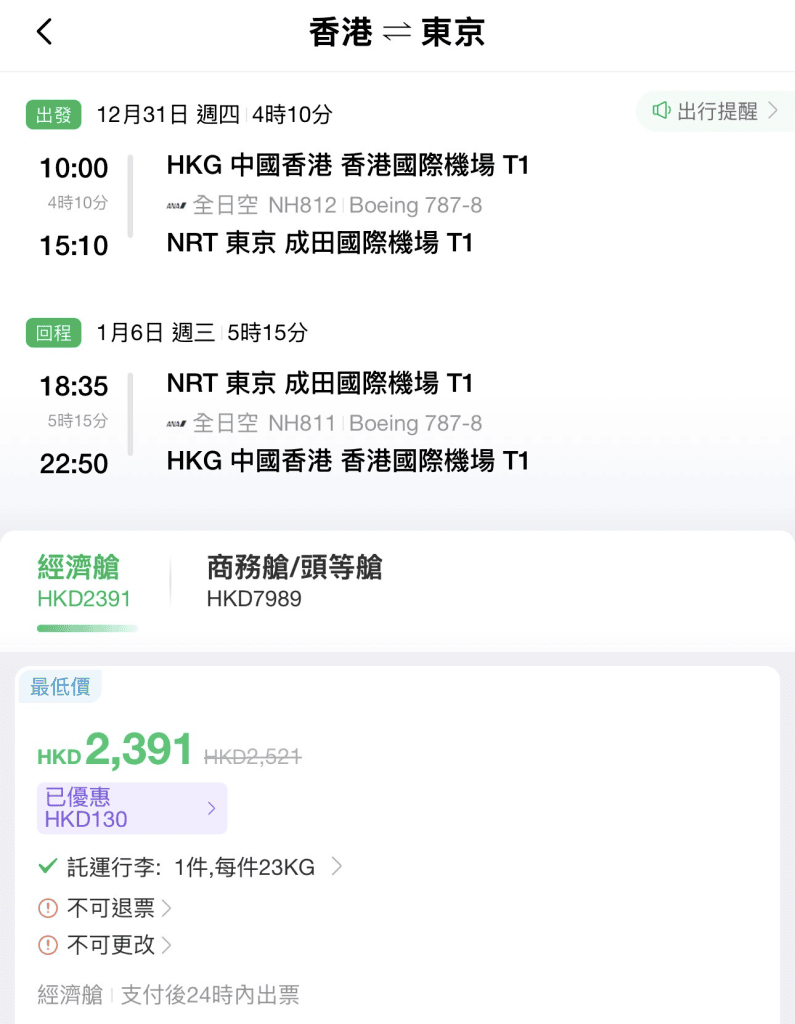 以12月31日出發,1月6日返回為列,香港飛東京成田來回連稅$2,391起