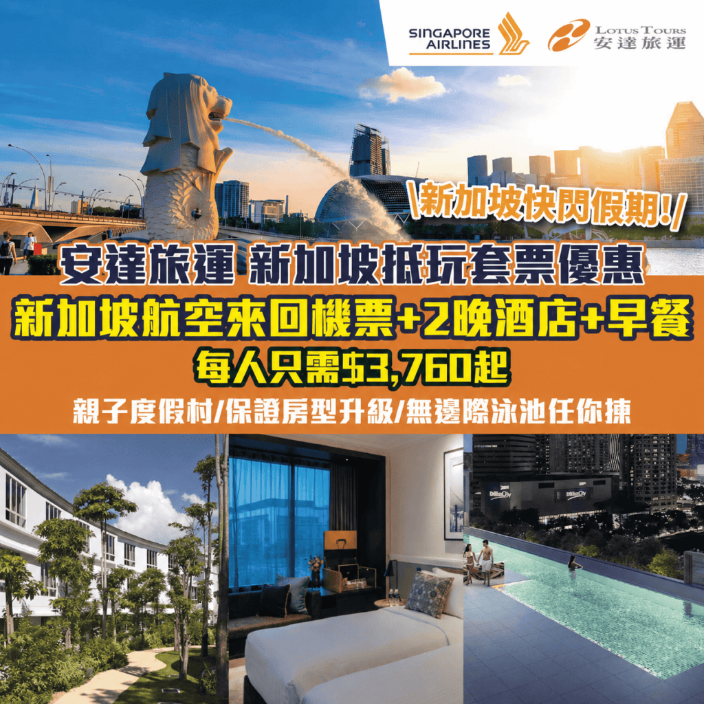 【安達旅運 新加坡抵玩套票優惠】新加坡快閃假期!新加坡航空飛新加坡+2晚精選酒店+早餐,每人只需$3,760起!親子度假村/保證房型升級/無邊際泳池任你揀!
