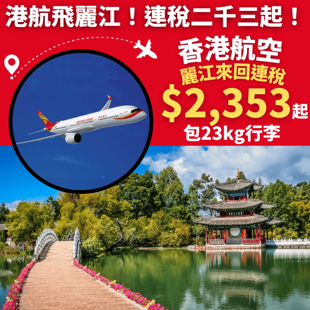 暑假旺季直飛麗江!連稅2千3起!包23kg寄艙行李!香港飛麗江來回連稅只需$2,353起 – 香港航空