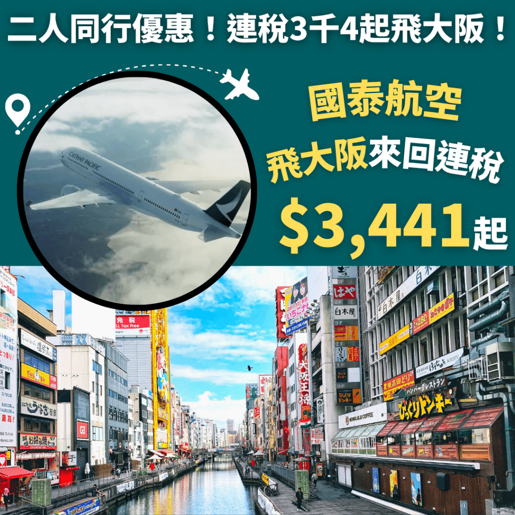 國泰飛大阪!連稅3千4起!7月10日前出發!香港飛大阪二人同行來回連稅每人只需$3,441起 – 國泰航空 (優惠至4月30日)