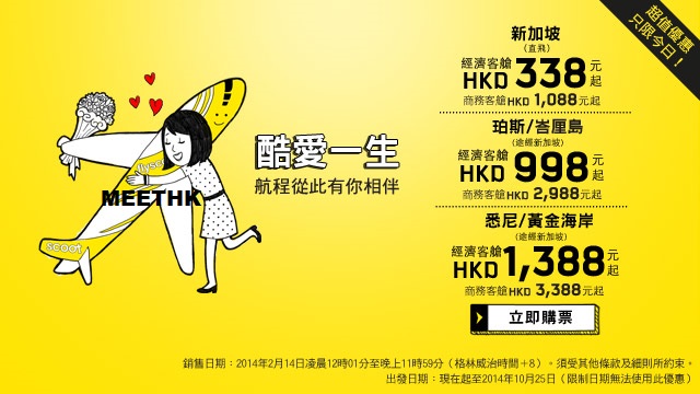 又有平機票要搶啦,今次輪到廉航Scoot (酷航),佢地岩岩推出左限時24小時情人節優惠