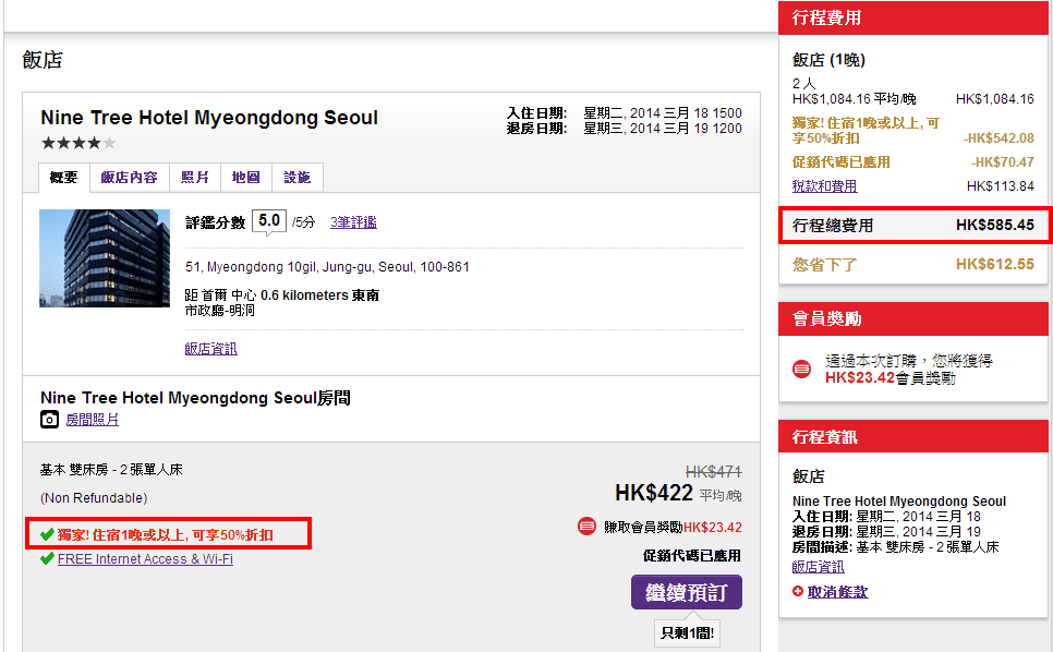 留意Hotelscombined中所顯示既HotelClub價錢為非會員價格,並非顯示今次介紹既會員五折優惠價格