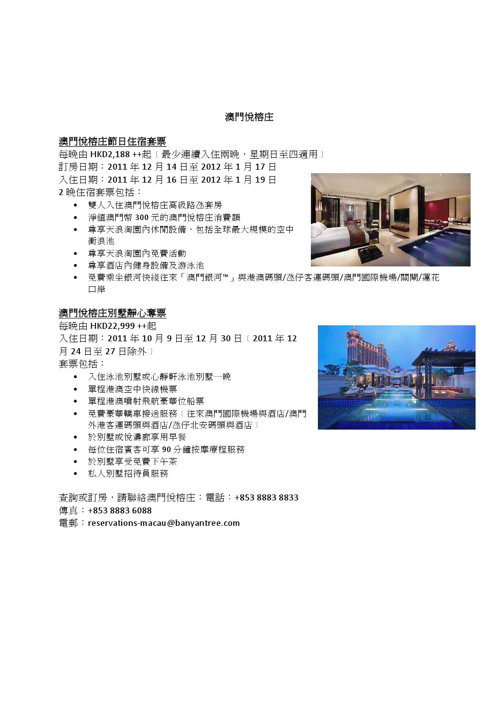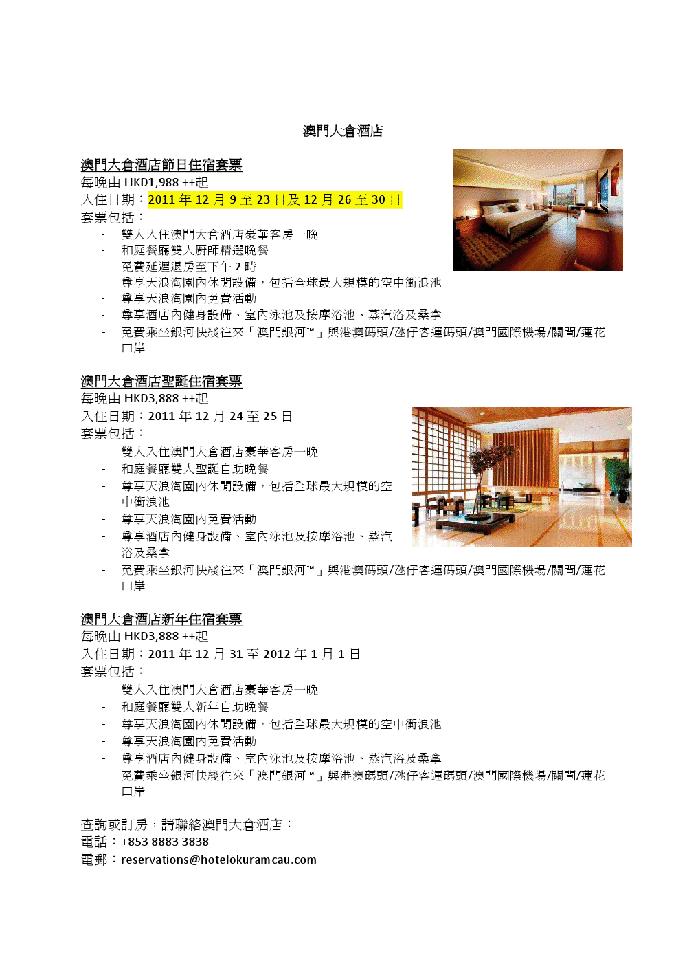 套票詳情大家可參閱以下圖片,查詢及訂購可致電或email至相關酒店訂房部