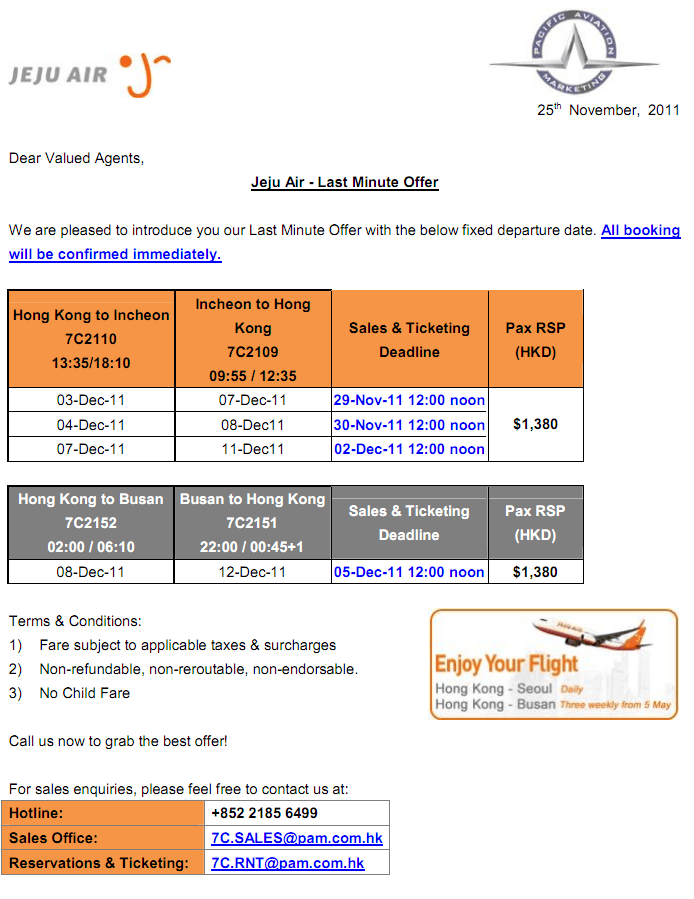 如要訂票, 請將乘客護照姓名, 電郵及聯絡電話發到 [email protected] 或致電濟州航空香港代理 2185 6499 查詢.