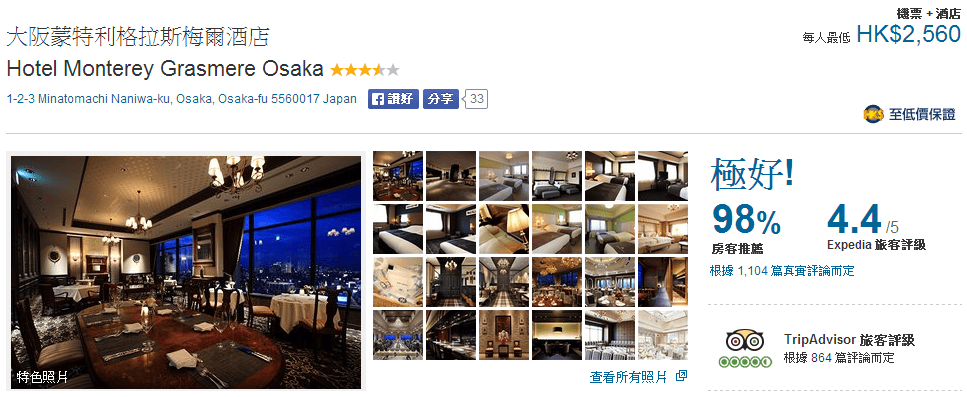 另外評價非常高既蒙特利格拉斯梅爾酒店,走歐陸風格,係地鐵同JR難波站隔離,好方便,每人連稅$2,560起,詳情:https://www.meethk.com/1eRhmnK