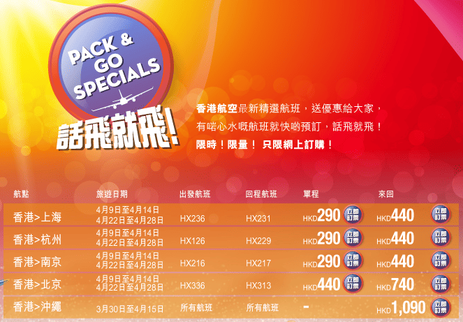 Last Minute優惠!香港往返台北只需$600,上海/杭州/南京$390,北京$690 – 香港航空