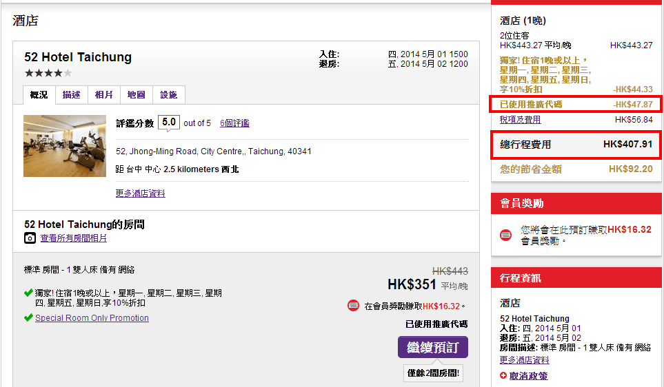 四星級既台中昭盛52行館推出左優惠,配合12%折扣代碼:LUCKY7,每晩只需$408起(已包稅) ,比其他酒店預訂網站平!
