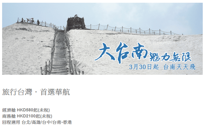 華航近日亦將台南優惠出發日期延長至6月底,價錢同之前一樣咁抵
