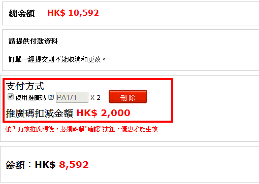大家記住要係付款頁面輸入推廣碼 “PA171” 先可以每位即時減$1,000 (如下圖)