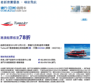 由即日起至2012年12月31日,憑建行(亞洲)信用卡購買TurboJet港澳普通位來回船票2套,只需560港元