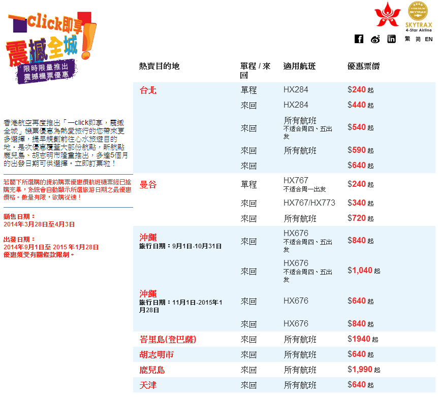 香港航空推出左新一輪”一click即享,震撼全城”機票優惠,價錢好吸引