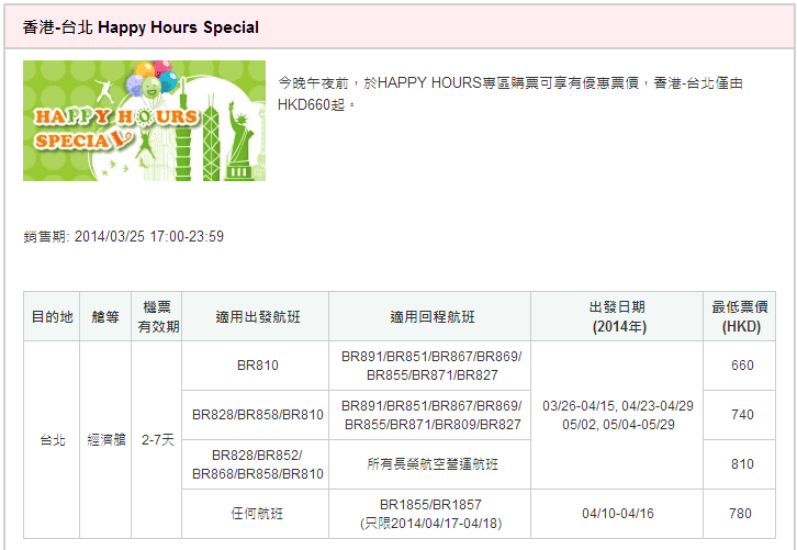 http://www.evaair.com/zh-hk/hongkong/happy_hours.html (想買$810既話,部份日子要揀$740呢個價先見到)