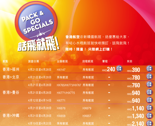 香港航空推出左新一期話飛就飛優惠,今期主打4月份出發