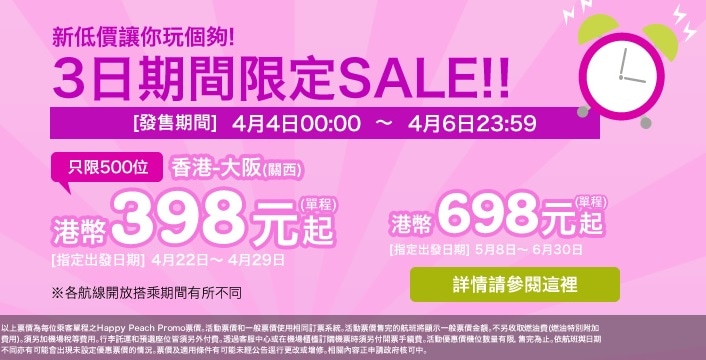 勁抵!開搶啦!香港飛大阪單程只需$398起 – 樂桃航空 (優惠至4月6日)