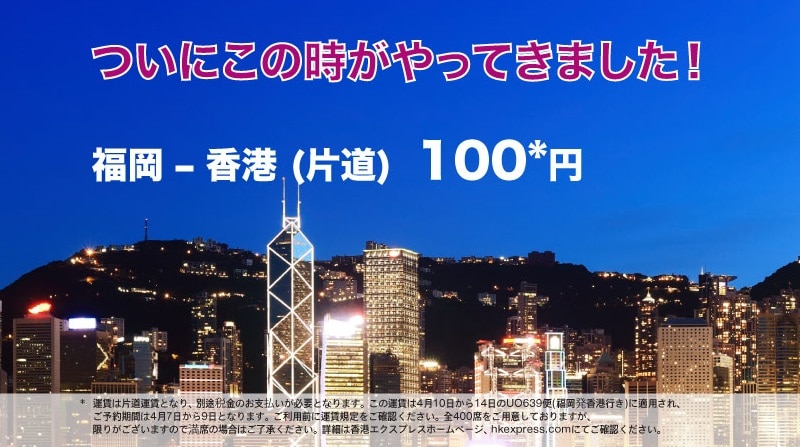 4月10日至14日由福岡飛香港單程只需100円,連稅1,070円(約港幣$78)
