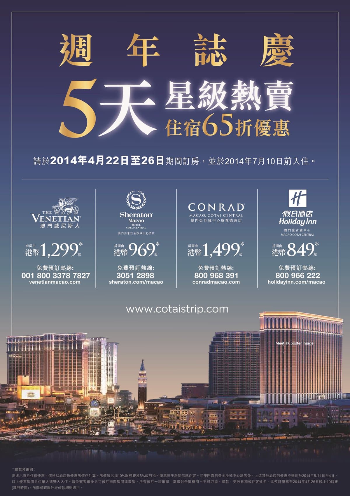 限時5天!澳門喜來登金沙城每晚連稅$1,114起,澳門威尼斯人$1,494起、澳門康萊德酒店$1,718起 (優惠至4月26日)
