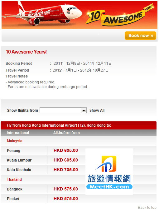 等我地 MeetHK.com 旅遊情報網 搶先向大家發放亞洲航空十周年大禮價格表,等大家預早作出搶票準