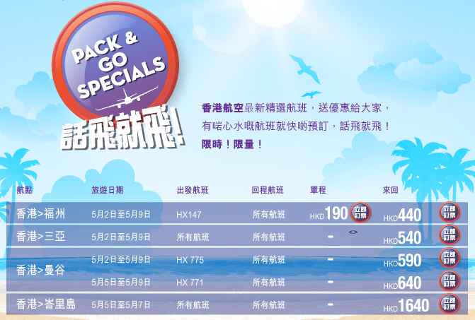 香港航空今晚12點(4月23日0:00)新一期話飛就飛優惠主打曼谷Last Minute優惠