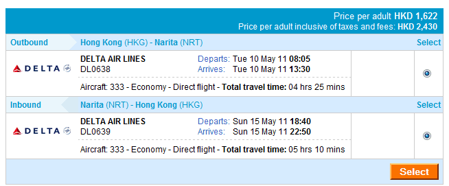 今次到達美航空 Delta 香港直航往返東京成田機場。係 ZUJI search 了一下,連稅最平只需$2,430