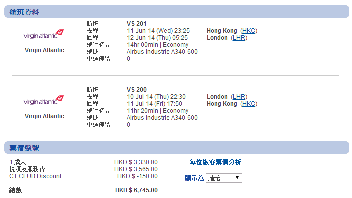 香港直航往返倫敦$3,330,用埋折扣代碼減$150,即$3,180,連稅只需$6,745,仲平過其他航空既轉機優惠