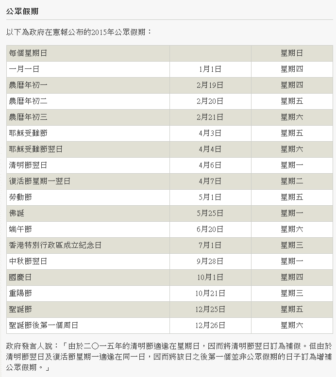 2015年香港公眾假期一覽 (General Holidays for 2015)