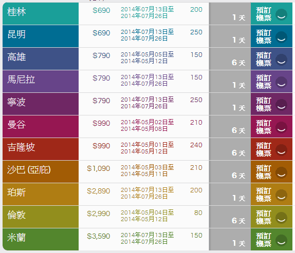 而高雄、曼谷、吉隆坡、沙巴、倫敦係介乎5月1日至5日12日指定日子來回