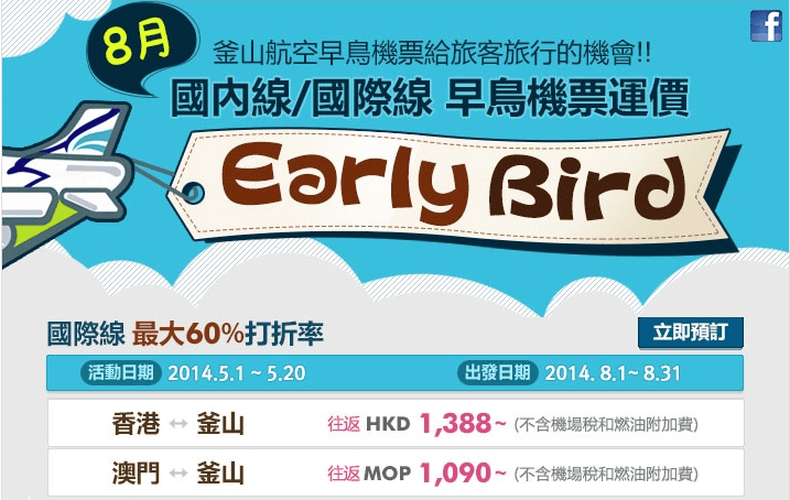 飛釜山有平機票啦,釜山航空岩岩推出左8月份出發早鳥優惠