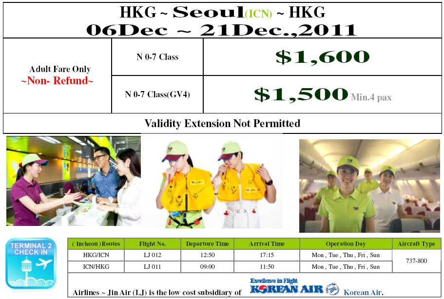 真航空 Jin Air 香港代理剛公佈左一個新優惠,香港往返韓國首爾四人同行每人$1,500 一人成行$1,600 ,另加稅約七百多