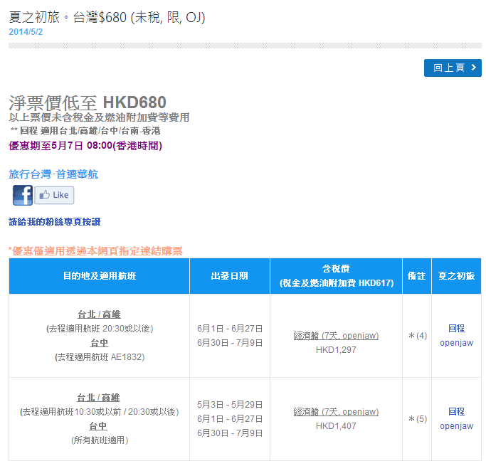 優惠可以open jaw,回程可以改由台北/高雄/台中/台南返香港