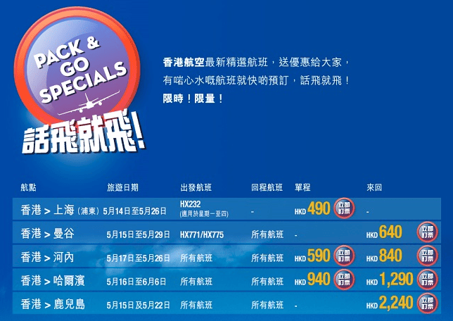 今晚12點(5月7日0:00)香港航空又有新一期話飛就飛優惠