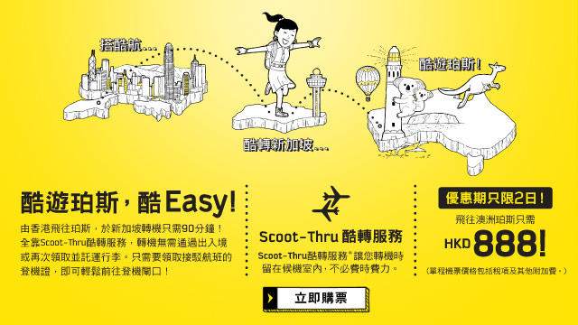 抵呀!香港飛珀斯單程連稅只需$888,來回連稅$2,057 – Scoot 酷航 (優惠至5月9日)